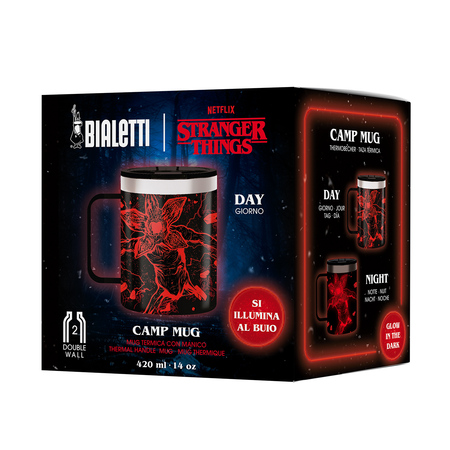 Bialetti – Camp Mug Stranger Things 420 ml – glow in the dark dio je nove kolekcije koju su ponovno zajedno predstavili Bialetti i Netflix. Kolekcija donosi jedinstvene, upečatljive proizvode inspirirane kultnom serijom. Cilj joj je pretvoriti svakodnevne trenutke u nešto posebno i drugačije, posebno za ljubitelje kave u pokretu. U ovoj liniji nalazi se nekoliko artikala s dvostrukom stijenkom i posebnim “glow-in-the-dark” efektom koji otkriva svijet Upside Downa kada se ugase svjetla.
